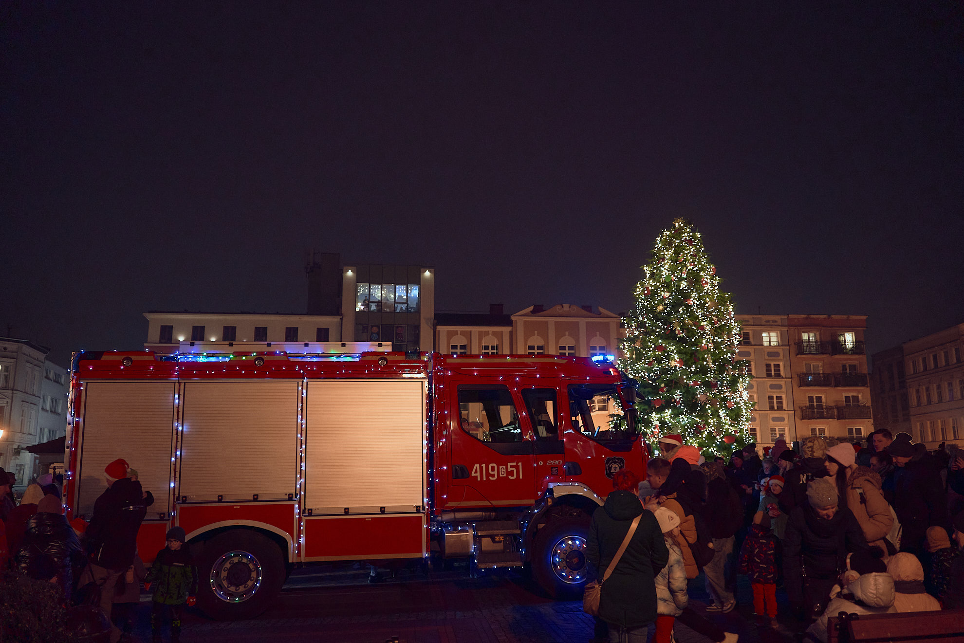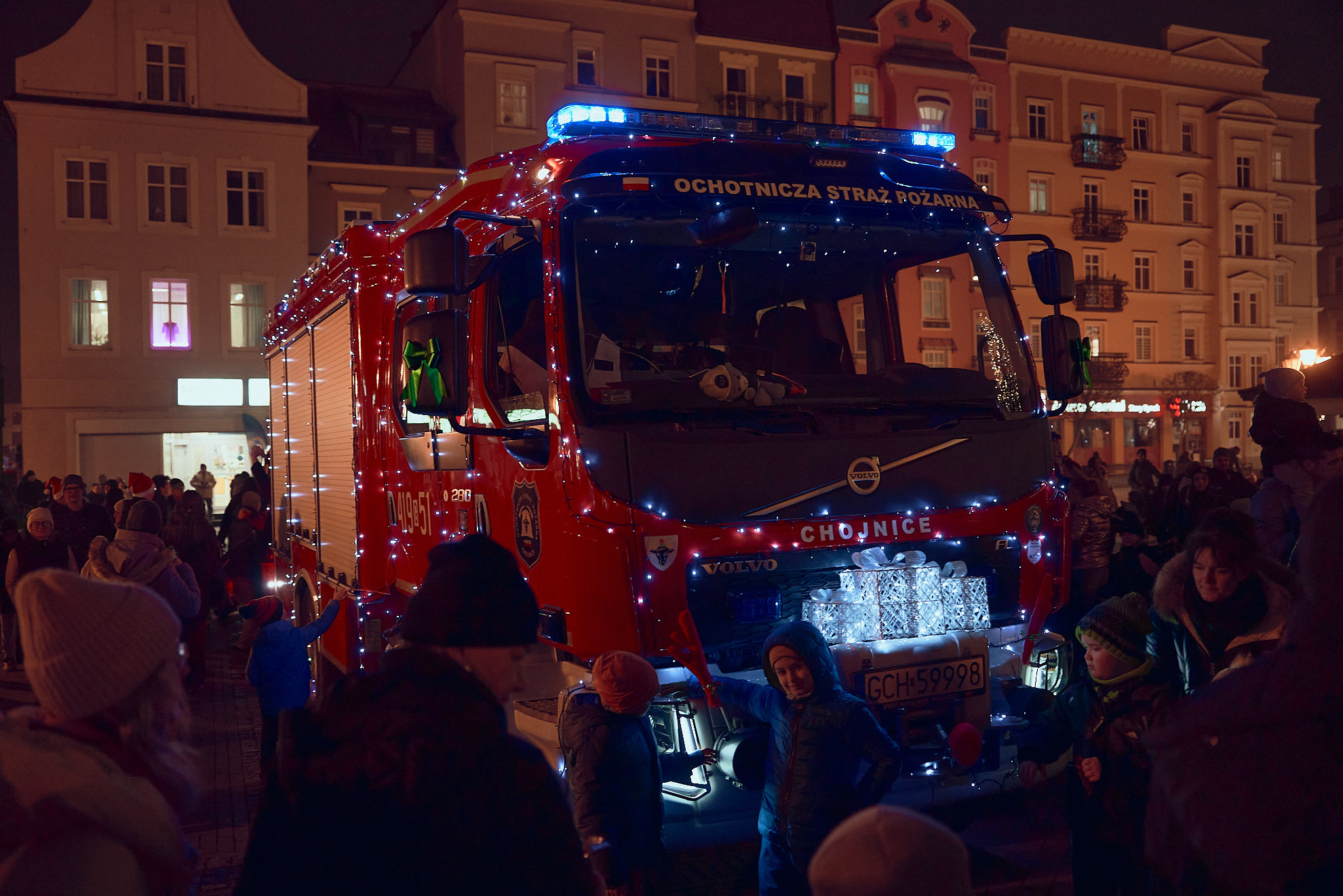 Punktualnie o 16:40 Święty Mikołaj wjechał w sobotę 6 rudnia na płytę chojnickiego rynku, by spotkać się z dziećmi i rozświetlić choinkę. Tradycyjnie już Mikołaja przywieźli strażacy OSP Chojnice w specjalnie przystrojonym i rozświetlonym na tę okazję wozie strażackim.