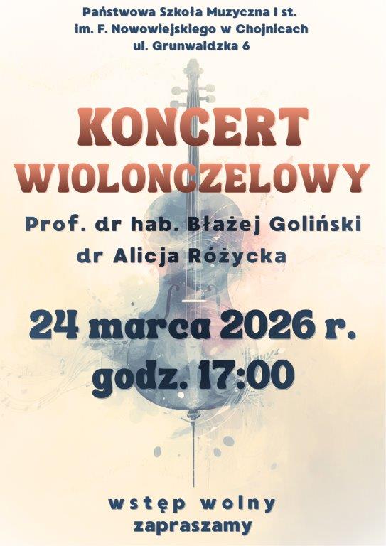 Lekki i wiosenny - taki ma być dzisiejszy koncert wiolonczelowy w Chojnicach. Organizuje go tutejsza Państwowa Szkoła Muzyczna. W sali koncertowej będzie zaś można posłuchać koncertmistrza Bałtyckiej Filharmonii i profesora Akademii Muzycznej w Gdańsku, prof. Błażeja Golińskiego. Towarzyszyć mu będzie nauczycielka klasy wiolonczeli, dr Alicja Różycka.